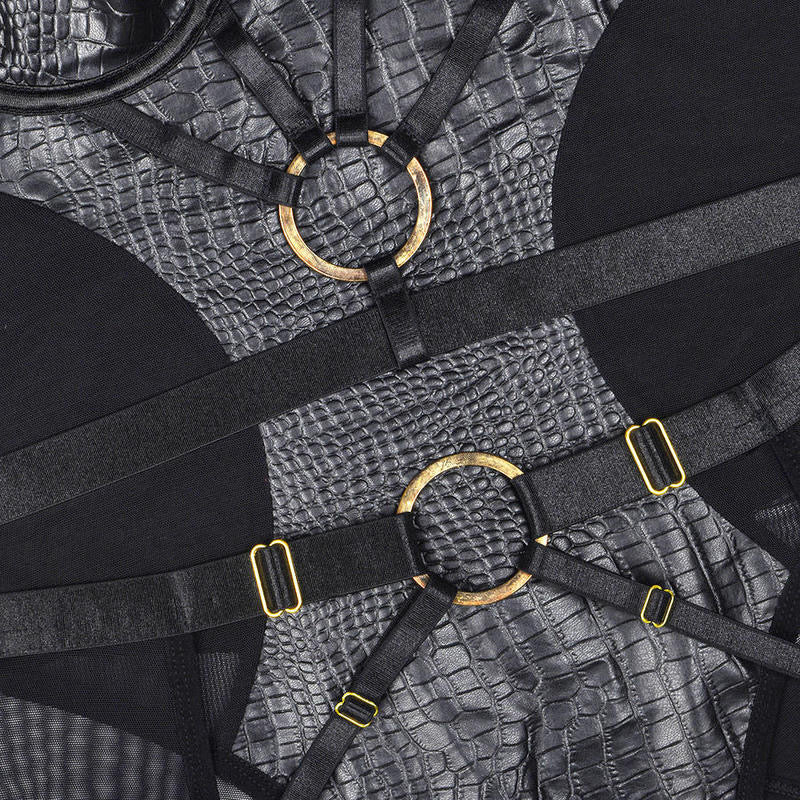 Unleash your inner temptress with this daring black harness bodysuit. Designed with texture and bold cut-outs, this piece blends elegance with edge. Adjustable straps and metallic O-ring details create a perfect fit that enhances every curve, while the open-back design adds an irresistible touch of sensuality.