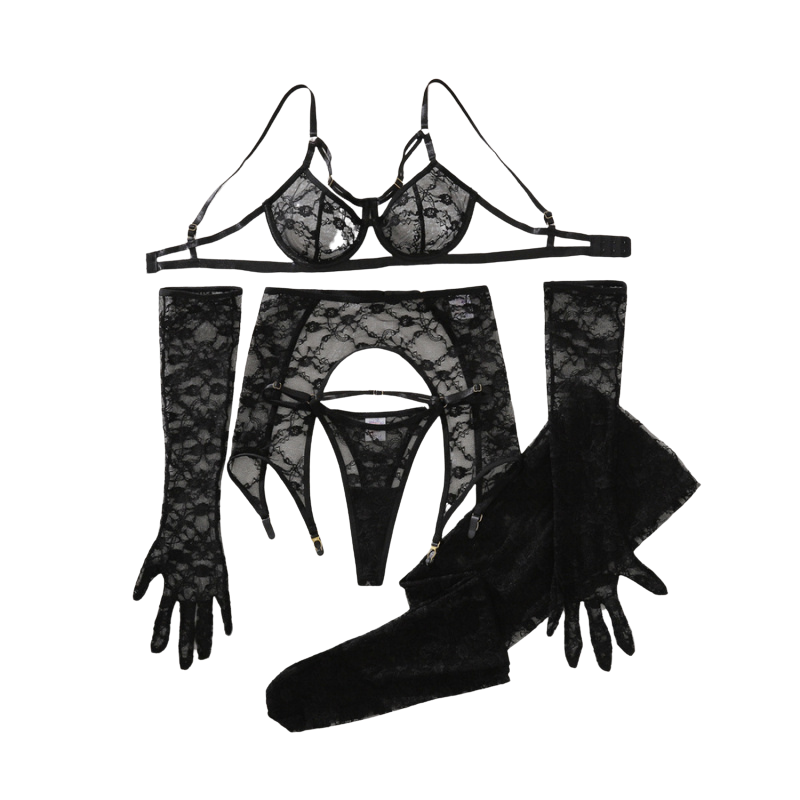 Embrace elegance and seduction in this breathtaking 6-piece black lace lingerie set, crafted to highlight your silhouette and ignite passion. Featuring delicate floral lace, this set includes a strappy underwire bra, thong, high-waisted garter belt, thigh-high stockings, and matching gloves — all designed to create a sophisticated yet daring look.
