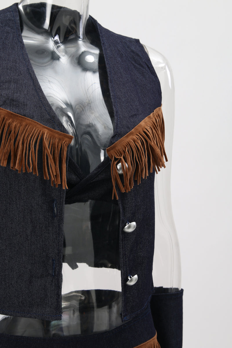 Turn up the heat in this bold Western Cowboy Costume Set. Featuring a playful mix of denim-look fabric and brown fringe details, this 3-piece outfit is perfect for roleplay, parties, or themed nights.
